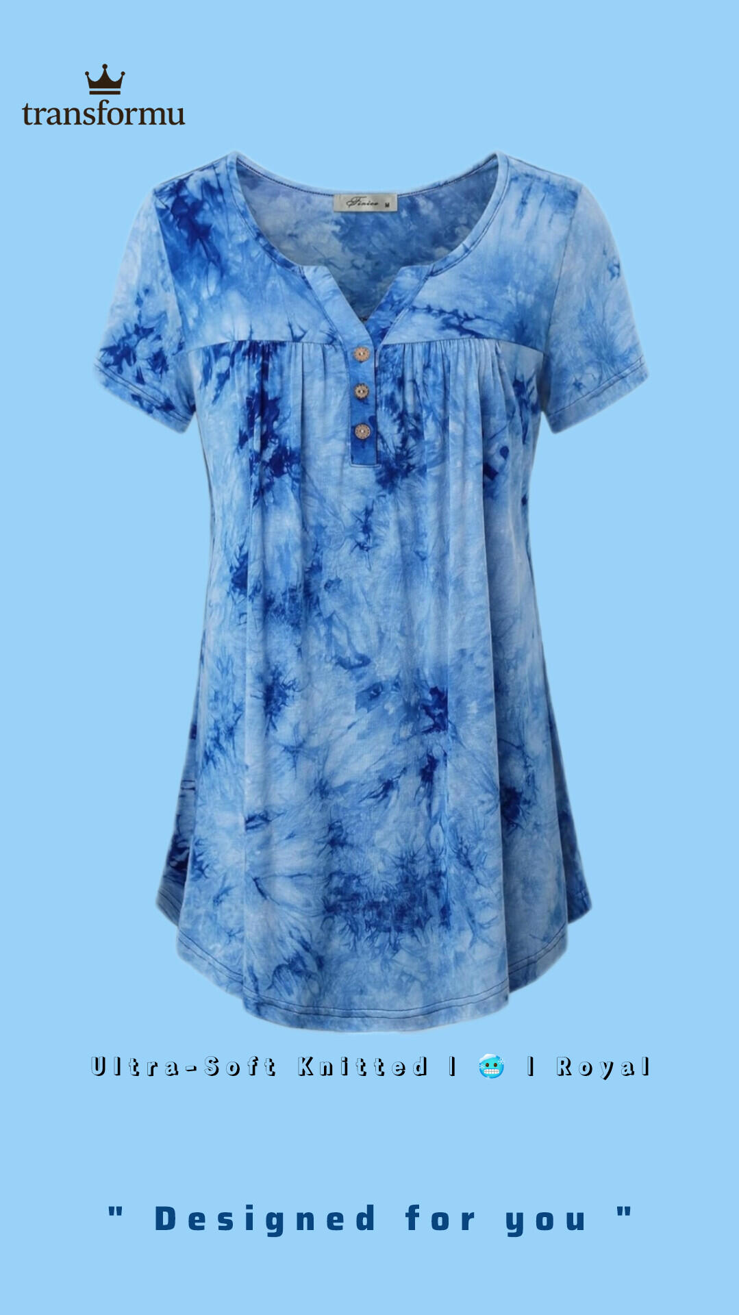 Pleated Tunic,Womens Loft Clothing Split V Neck T Shirts Classy Lightweight Short Sleeve Tie-Dye Printed Button-Up Ultra-Soft Knitted Youth Blouse Pullover Tees Royal Blue