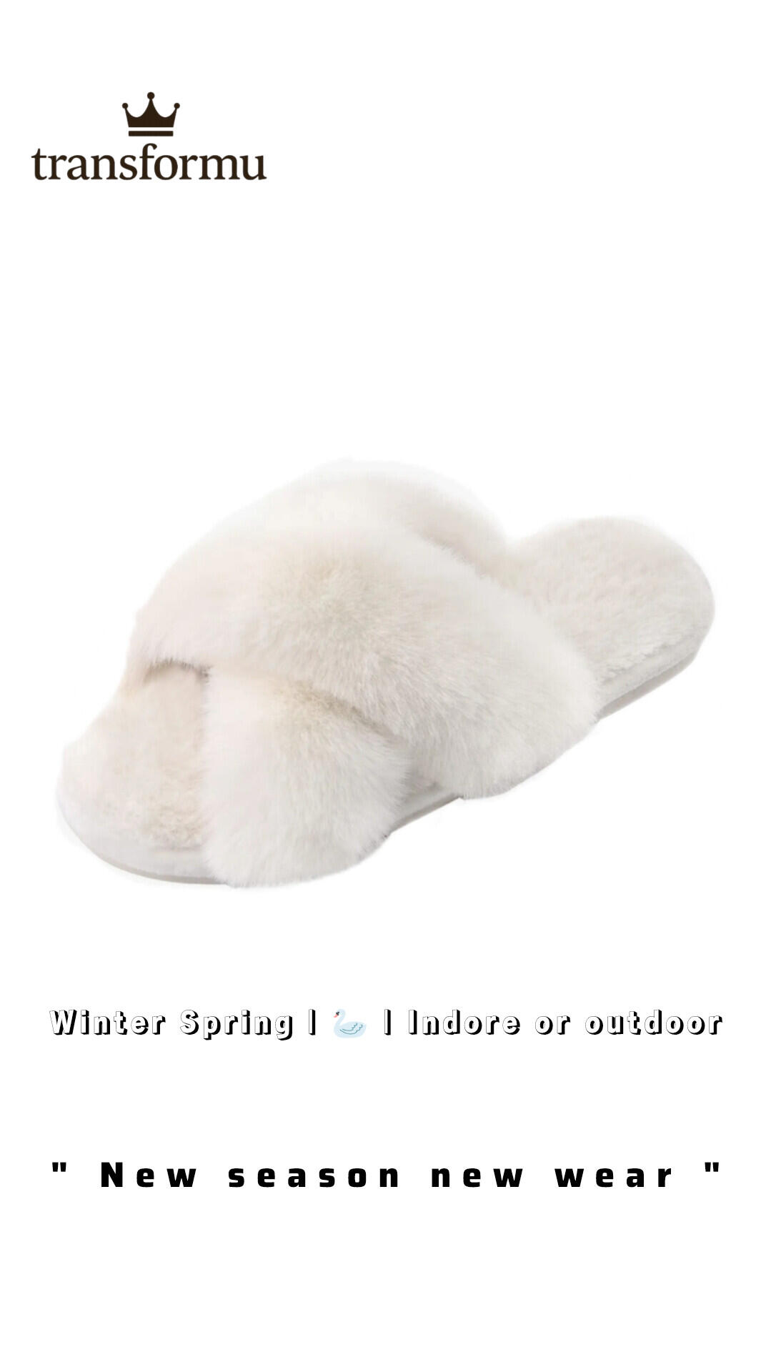 Women's Cross Band Slippers Soft Plush Furry Cozy Open Toe House Shoes Rabbit Fur Indoor Outdoor Warm Comfy Slip On Breathable for Winter Spring Off White